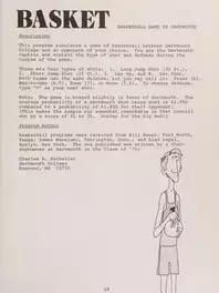 The first Basketball video game. You play against the computer in a text-based game of Basketball, with the ability to select both defensive setup and offensive plays each turn.